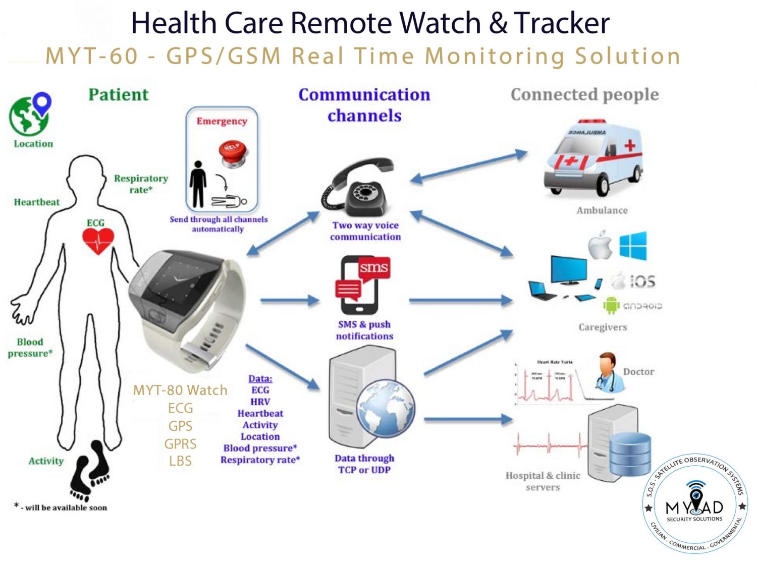 Advanced watch with multiple remote monitoring capabilities.  These include: